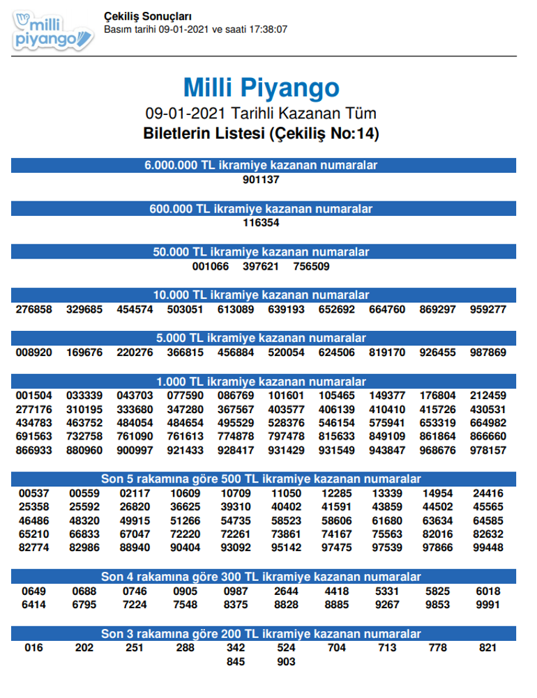 Milli piyango i̇daresi tarafından çekilişi yapılan yeni milli piyango şans oyununun yeni milli piyango sonucu. Milli piyango'nun, yılbaşı özel çekilişinde 100 milyon liralık büyük ikramiye, 9884757 numaralı bilete isabet etti. Bastırılmış numaralı biletlerin satılarak, adet ve tutarları önceden belirlenmiş ikramiyeleri. 31 aralık 2020 tarihli oyuna ait yeni milli piyango çekiliş sonucu. Milli piyango i̇daresi tarafından düzenlenen büyük çekilişlerde ikramiyeler sahiplerini bulmaya devam ediyor.